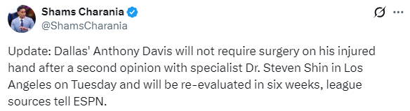 Shams进一步报道,独行侠正和多队重启关于浓眉的交易谈判,他透露称:即使在这次韧带损伤情况被披露后,消息人士透露,独行侠已重新与多支对浓眉感兴趣的球队展开谈判。这些球队认为,或许浓眉有机会在季后赛期间复出,并且未来两到四年内仍能成为球队的长期核心。