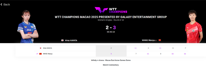 北京时间9月12日,WTT澳门冠军赛女单1/8决赛,国乒选手王曼昱3-2逆转日乒选手早田希娜,五局比分:7-11,11-3,9-11,11-6,11-7。也就是说王曼昱在1-0落后与1-2落后的情况下完成大逆转,世界第二打出风采。